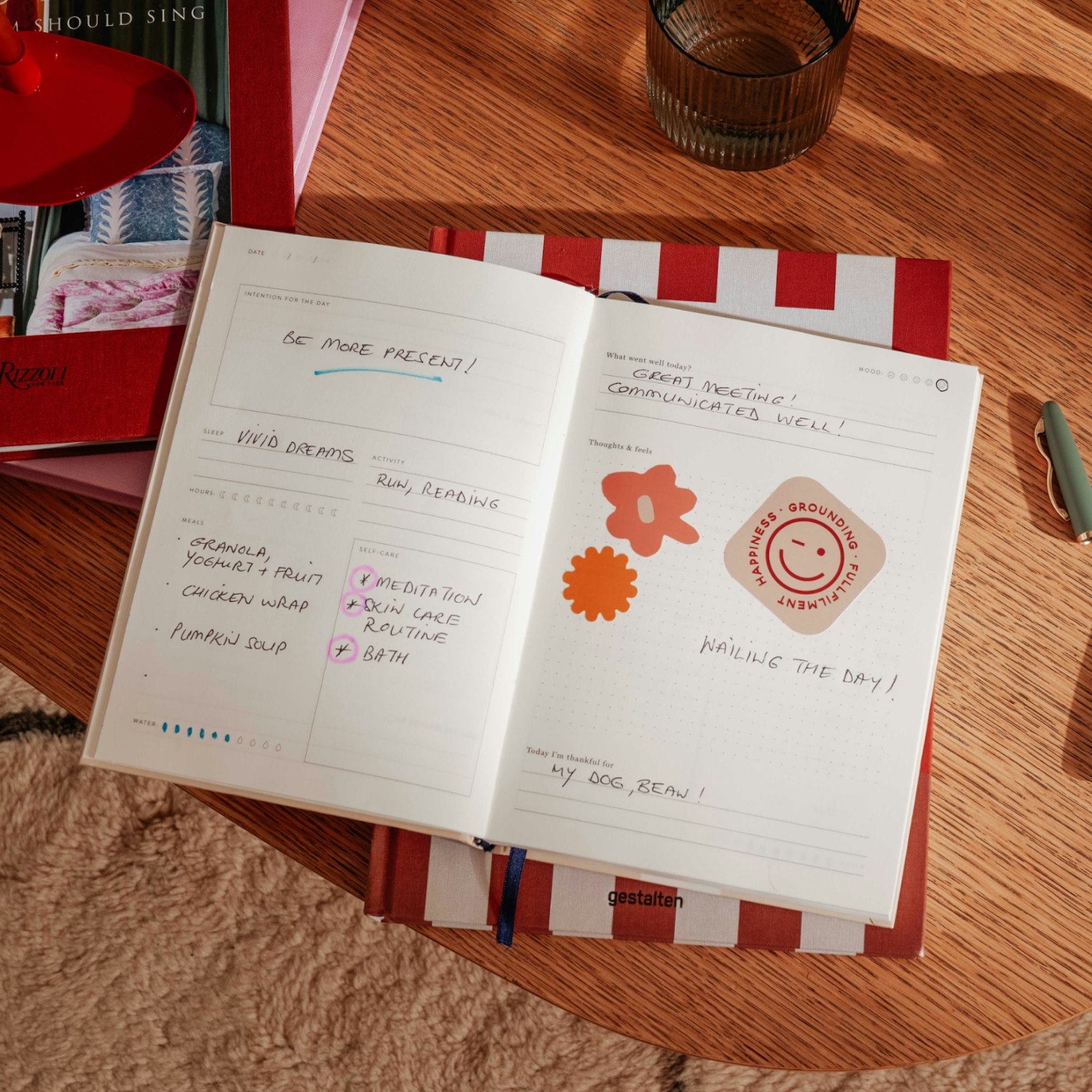 You want to aim for a holistic approach, so try to keep the various pillars in mind. Remember, intentions can be big or small – avoid comparing yourself to others and focus on things that will make you feel your best. It’s not one-size-fits-all when it comes to wellbeing, and part of using a journal is figuring out what works for you.